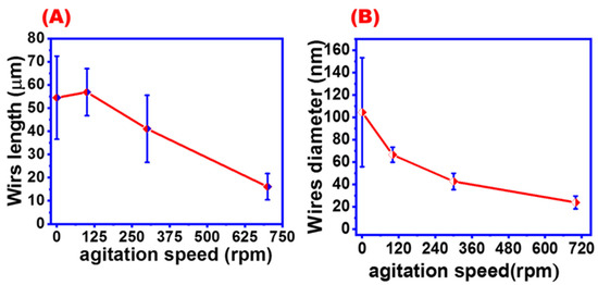 Figure 9 summarizes the dependence of AgNW morphology on agitation speed. Figure 9A shows that the average length of the synthesized AgNWs slightly increased at 125 rpm and then gradually decreased with increasing agitation speed. On the other hand, Figure 9B shows that AgNWs prepared with high agitation speeds were thinner than those obtained at low agitation speeds. These results agree with previous reports [47,48]. This behavior may be attributed to the fact that the increased agitation speed leads to high surface energy on the face of (111) that facilitates the Ag seeds to form multi-twin particles, and accordingly, small seeds are produced, which leads to the formation of a thinner wire [47].