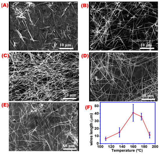 Temperature is believed to be significant in controlling the growth of AgNWs crystals [49]. Figure 10A–E demonstrate SEM images of AgNWs obtained at different temperatures at 110, 135, 160, 175, and 190 °C, while Figure 10F shows the relation between temperature and average AgNW length. The length of AgNWs is affected by the reaction temperature, as indicated by the gradual increase in the average length of AgNWs at a temperature range between 110 and 160 °C, followed by a rapid decrease at a temperature above 160 °C, until 195 °C. This decrease in average wire length may be attributed to the destruction of AgNWs being produced at temperatures over 175 °C.