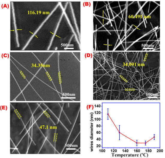 SEM images for AgNWs obtained at different temperatures; (A) 110 °C, (B) 135 °C, (C) 160 °C, (D) 175 °C, (E) 190 °C, and (F) effect of the reaction temperature on AgNW diameters.