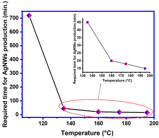 As was mentioned earlier, reducing reaction time is of great economic significance. In this study, the time required to form the wire at 110 °C was about 12 h. Figure 12 shows the relation between reaction temperature and reaction time. The time required to produce AgNWs decreased from 12 h to 20 min when the reaction temperature was raised from 110 to 160 °C. These results are consistent with previous research [32,49]. As was found in the literature, using temperatures between 160 to 180 °C will produce good AgNWs, but from an economic point of view, using elevated temperatures for a longer time will increase the cost of AgNW production. Therefore, reducing the reaction time in our one-step synthesis to 8 min compared to 45 min in the traditional polyol method is an advantage.