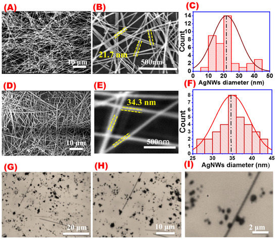 The addition of metal halide ions was found to facilitate the formation of AgNW crystal growth [51,52,53,54,55]. In the current study, Br−, Cl−, and I−. were used as co-nucleants to obtain AgNWs. Figure 13 shows SEM images of AgNWs synthesized by using different Potassium halides. Ultrathin AgNWs (20 nm) were obtained by using 0.005 g KBr which functioned as a co-nucleant that may inhibit the lateral growth of nanowires Figure 13A–C. An average length of 23.6 μm and an average diameter of 21.67 nm were obtained when using Br as a source of halogen in this study (Figure 13C). When using chloride ions, an average length of 58.25 μm and an average diameter of 34.3 nm were obtained (Figure 13D–F). On the other hand, Ag debris, AgNPs, and very few wires were observed when using iodide salts as shown in (Figure 13G–I).