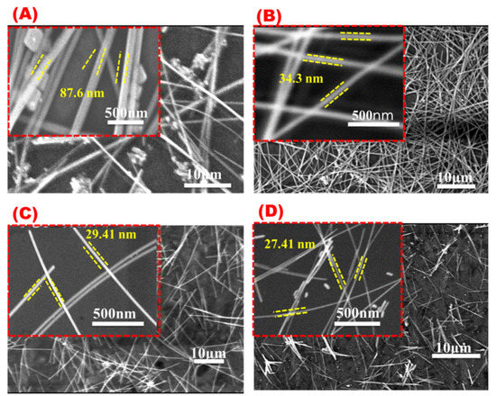 Figure 14 shows SEM images for AgNWs synthesized with different concentrations of potassium chloride. By increasing the amount of KCl, AgNWs not only become thinner but also shorter and more nanoparticles and debris will be obtained. Figure 15A,B summarizes the effects of potassium chloride concentration on the AgNWs’ morphologies. AgNWs’ average length reached a maximum length of about 55 microns at a KCl concentration of 2.6 mM, whereas the average length gradually decreased with the increase in KCl concentrations (Figure 14A). The diameters of AgNWs became thinner by increasing potassium chloride concentration, which is in agreement with the previous studies (Figure 15B) [57].