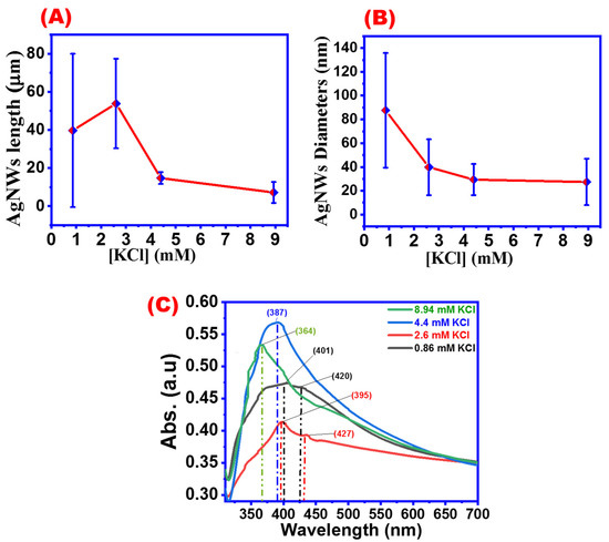 Effect of KCl concentrations on (A) AgNW diameter, (B) AgNW length, and (C) UV absorbance spectra of AgNWs obtained with different KCl concentrations.