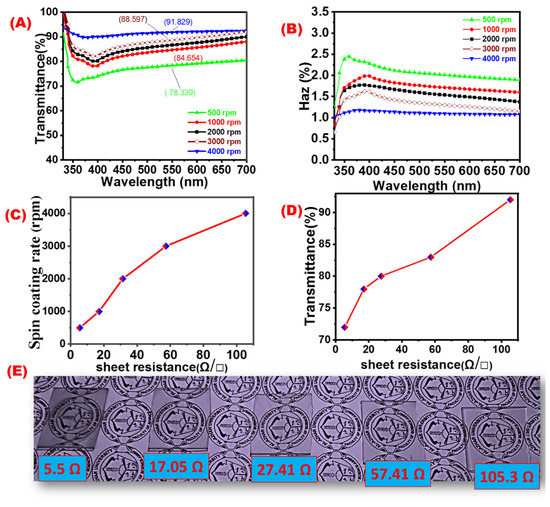 AgNWs-TCF designed under different spin coating rates: (A) transmittance (at λ = 550 nm), (B) optical haze, (C) sheet resistance, (D) transmittance, and (E) images of AgNWs-TCFs with different coating thickness.