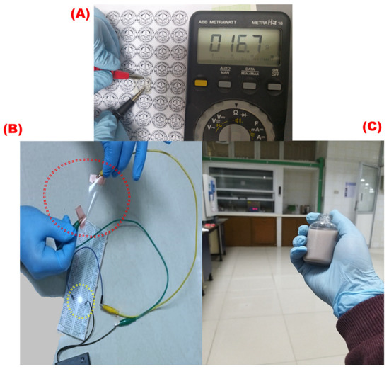 (A) AgNW electrode image with a sheet resistance of 17.3 “Ω/sq”, (B) electrical circuit for the flexible AgNW electrode, and (C) the AgNW ink with a concentration of 4 mg/mL.