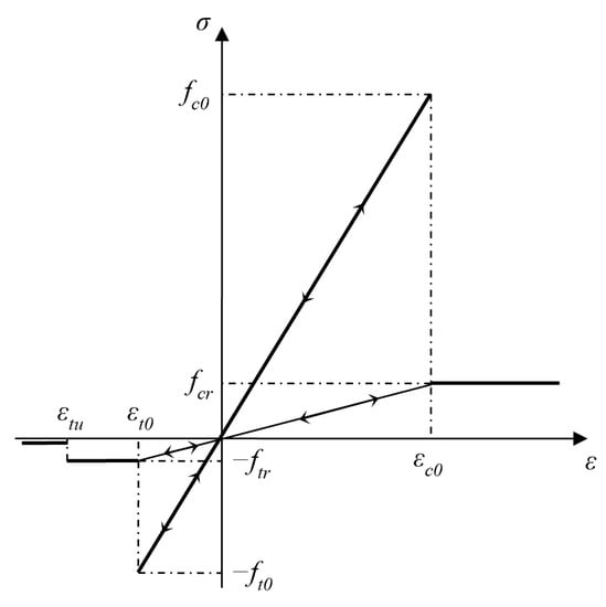In Figure 2, the stress–strain relationship of mesoscopic elements under a uniaxial stress state is shown in RFPA. When the stress state of an element reaches the failure criterion provided by the user, the software will determine that the element is damaged at the current time step. Meanwhile, the degradation of the element elastic modulus during the loading process can be determined according to the following equation: