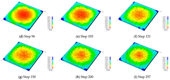 Figure 4 shows that the model gradually cools down to about 300 °C with a slow cooling rate. From Figure 4a,b, it can be seen that because there is no constraint around the surrounding boundaries under the effect of cold shrinkage, fractures start to sprout around the model. Figure 4c indicates that due to the thin thickness of the model, fractures first generate at the weak areas and then extend to the upper and lower surfaces of the model. Meanwhile, the directions of the generated fractures are mainly perpendicular to the model boundaries.