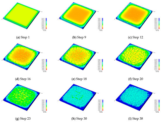 Figure 5 shows the fracture evolution of ceramic glaze during the fast cooling process. The model is only constrained at the bottom, and the outer parts of the model are first cooled during the rapid cooling. The temperatures of the outer parts of the model are obviously different from those of the internal parts, forming high inner temperature stresses, as shown in Figure 5a,b. Because the glaze layer is on the surface of the ceramics and the glaze layer cools faster, such cooling causes the glaze layer to shrink dramatically. Under the constraint of the blank, high tensile stress concentrations occur on the surface of the glaze layer. As the temperature decreases, the tensile stress accumulated on the surface quickly increases, and new cracks are generated. At the early cooling stage, micro-cracks on the model surface are mainly generated and distributed at the outer parts of the model, as shown in Figure 5c. As the temperature decreases, the cracks propagate towards the inner parts of the model, as shown in Figure 5d,e, and then gradually gather to form craquelures, as shown in Figure 5f,g. Then, the large blocks are divided into small blocks. After the temperature distribution reaches the ambient temperature, few new cracks are generated, as shown in Figure 5h,i. The obvious differences from when compared to the results of slow cooling are that the propagation speed of the fractures is relatively rapid under fast cooling, the effect of the temperature difference is relatively small, and the size of the blocks divided by fractures on the model surface is larger and more uniform.