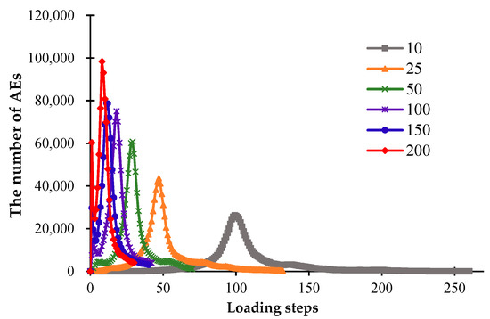 During the fracture evolution of ceramics, the release of elastic energy causing the formation of fractures can occur in the form of acoustic emission (AE). In this study, the AE events produced during the simulations can be modeled by the RFPA code. Figure 7 shows that when β = 10 W/(m2·K), the model cools down slowly, and the peak of AE events appears late. During the cooling progress, the AEs increase gradually, and the appearance of the peak of AE events mean that the model is completely broken. As the heat transfer coefficient increases, the AE peak appears earlier, and the model cools down to the ambient temperature more quickly. When the heat transfer coefficient reaches more than 50 W/(m2·K), the cooling speed of the models becomes faster, and due to the rapid cooling, a large amount of AE events will be generated at the early stage of cooling, and the peak of the AE curve will appear earlier. Simultaneously, a larger heat transfer coefficient will lead to a larger number of AE events, as shown in Figure 7.