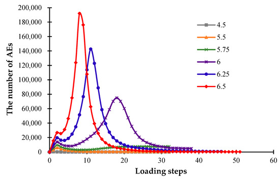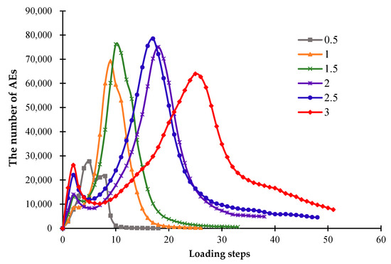 Figure 11 shows that when the models with different thicknesses are cooled to the ambient temperature, the number of AEs display various responses. It can be seen that as the model thickness increases, more loading steps are required for cooling to the same level. When the model starts to cool down, there are many damaged areas on the ceramic surface due to rapid cooling from a high temperature, which may result in the first small peak of released AEs. As the cooling continues, the thinner model will produce a later second AE peak, and the model destruction will appear later. Namely, with the growth of the model thickness, the peak of released AEs appears relatively late, and the cooling time required to generate the macro failure of the model increases. This phenomenon occurs because greater temperature stresses are required to break the thicker model. Furthermore, when the thickness increases to a certain value, the number of cracks on the model surface will be largely reduced, and the destruction of the model becomes more difficult.