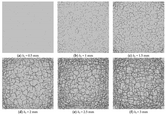 Figure 12 shows that as the thickness of the glaze layer increases, cracks appear on the surface of the glaze layer when the model temperature reaches the ambient level. Figure 12a,b shows that when hg = 0.5–1 mm, there are a few microcracks scattered on the surface of the glaze layer, and no apparent through-cracks occur. Figure 12c indicates that when hg = 1.5 mm, some penetrating cracks begin to appear and spread over the model surface. Figure 12d–f demonstrates that as the layer thickness increases to 2 mm, more and more cracks spread over the model surface. Namely, as the model thickness increases, the number of cracks continues to rise. When the thickness of the glaze layer grows up to a certain level, the growth rate of the number of cracks becomes smaller. Additionally, with the thickness of the glaze layer increasing, the temperature stresses required to produce cracks becomes larger, meaning that the model is more difficult to be destroyed. From Figure 13, we can see that the fractal dimension shows a sudden increment when the glaze thickness rises from 0.5 mm to 1 mm, while after that, the fractal dimension rises slightly with the continuous increase in the glaze thickness.