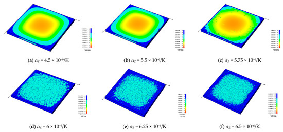 Figure 16 shows that the distribution and density of generated cracks change with the increase in the CTE of the glaze layer. Figure 16a indicates that when the CTE of the glaze layer is smaller than that of the blank, few cracks occur during the cooling process of the model. From Figure 16b, it is clear that when the CTE increases to 5.5 × 10−6/K, only a few microcracks appear, with little influence on the stability of the model. However, Figure 16c demonstrates that when the CTE rises to 5.75 × 10−6/K, some large-scale cracks began to appear at the outer parts of the model, but they do not extend to the center of the model. It is worth noting that in Figure 16d, when αg = 6 × 10−6/K, many cracks began to form on the model surface. Namely, as the CTE increases from 5.5 × 10−6/K to 6 × 10−6/K, the number of cracks rises quickly. Figure 16e,f shows that when αg increases to a certain value, the number of cracks remains nearly the same.