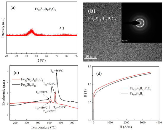(a) XRD curve of as-spun Fe82Si2B13P1C3; (b) HRTEM image and SAED pattern of as-spun Fe82Si2B13P1C3; (c) DSC curves of Fe80Si9B11 and Fe82Si2B13P1C3; (d) Magnetization curves of Fe80Si9B11 and Fe82Si2B13P1C3.