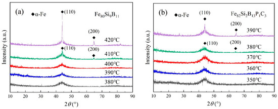Based on the DSC test results, Fe80Si9B11 underwent annealing within the temperature range of 380–420 °C, and Fe82Si2B13P1C3 was annealed at temperatures between 350 and 390 °C. The XRD spectra of the amorphous iron cores are displayed in Figure 3a,b. From the figures, it can be observed that, when Fe80Si9B11 was annealed at ≤400 °C and Fe82Si2B13P1C3 was annealed at ≤370 °C, a diffuse diffraction peak appeared near 2θ = 45° for both alloys, indicating the retention of their amorphous state. However, when Fe80Si9B11 was annealed at ≥410 °C and Fe82Si2B13P1C3 was annealed at ≥380 °C, the diffuse peak became sharper, suggesting the precipitation of trace crystalline phases. These crystalline phases can be identified as α-Fe(Si) with a body-centered cubic (bcc) structure. Furthermore, the XRD spectra revealed that, with the increasing annealing temperature, the intensity of the diffraction peak corresponding to the α-Fe(Si) phase gradually strengthened, indicating an augmentation in the crystallization fraction of the α-Fe(Si) phase as the annealing temperature rose.