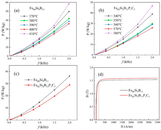Figure 4c depicts the frequency-dependent loss curves of Fe80Si9B11 annealed at 400 °C and Fe82Si2B13P1C3 annealed at 370 °C under an excitation of 1.4 T. It is evident that, within the frequency range of 50 Hz to 2 kHz, Fe82Si2B13P1C3 exhibits lower losses compared to those of Fe80Si9B11 at 1.4 T.