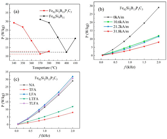 (a) TFA losses under different temperatures at 10.6 kA/m, 1.4 T, 2 kHz; (b) Losses at 370 °C when the transverse magnetic field was varied; (c) Loss curves of NA, TFA, LFA, LTFA and TLFA at 370 °C.