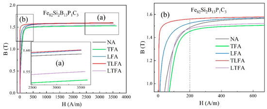 Figure 8 illustrates the magnetization curves of Fe82Si2B13P1C3 amorphous iron cores subjected to various treatments: NA, TFA, LFA, TLFA and LTFA at 370 °C. In Figure 8a, under an applied excitation of 3500 A/m, the Bm values of the treatment processes were arranged in ascending order as TFA < LTFA < NA < LFA < TLFA. Particularly, the Bm values of LFA and TLFA closely overlapped, both reaching 1.6 T. Figure 8b presents enlarged images at the inflection points. The ordering of Bm values under an excitation of 200 A/m was consistent with that under 3500 A/m. Notably, the LFA magnetization curve exhibited a distinct rectangular shape, enhancing the maximum permeability and residual magnetic induction strength while also increasing the loss. Conversely, TFA resulted in a flattened magnetization curve, promoting a more stable magnetic permeability, lower residual magnetic induction strength and reduced loss. The low-loss amorphous alloy iron core proves to be an exceptional material for pulse transformers. Magnetic field heat treatment can introduce uniaxial magnetic anisotropy to the amorphous iron core, enabling precise control of its size, direction and modulation of the magnetization curve to fulfill specific application requirements.