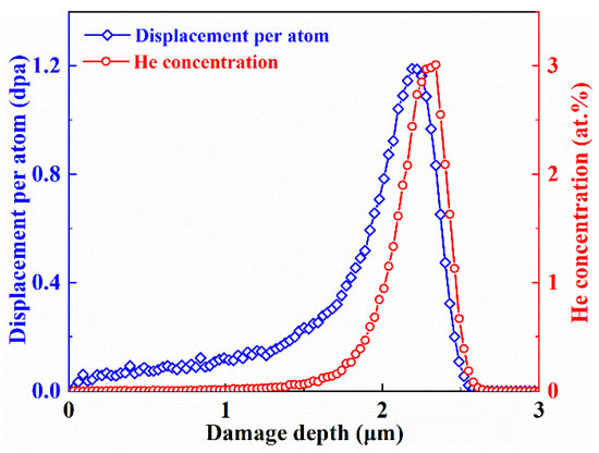 The irradiation tolerance of the selected representative alloy (Hf1Ta) was identified by He ion irradiation at 1023 K. The prepared specimens were irradiated with 1 MeV He ions to the fluences of 1 × 1016 and 3 × 1016 ions/cm2 at the Shanghai Institute of Applied Physics, Chinese Academy of Sciences (SINAP-CAS, Shanghai, China) using a 4 MV Pelletron accelerator. The sheets (sized 1 mm × 6.5 mm × 10 mm) for the irradiation experiments were taken from the as-cast Hf1Ta HEA. Then, mechanical polishing and electro-polishing were used to optimize the irradiated surface of the samples. At the fluence of 3 × 1016 ions/cm2, the irradiation damage and He concentration along the depth direction were predicted by Stopping and Range of Ions in Matter (SRIM-2008, http://www.srim.org/, accessed on 3 March 2022), as shown in Figure 1. The displacement energies were set as 30, 40, 90, 40, and 91 eV for the Ti, Zr, Hf, V, and Ta elements, respectively. Simulation results showed that the peak irradiation dose and He concentration were ~1.2 displacements per atom (dpa) and 3.0 at.%, respectively. For observing the microstructures and He bubbles characteristics, the transmission electron microscopy (TEM, Themis Z G3, Thermo Fisher Scientific, Waltham, MA, USA) was employed. Thin films with a thickness of ~60 nm were fabricated by the focused ion beam (FIB, Helios G4UX, Thermo Fisher Scientific, Waltham, MA, USA).