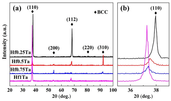 (a) The X-ray diffraction patterns of the Ti2ZrHfxV0.5Ta HEAs; (b) corresponding detailed scans of the (110) peaks of the BCC phase.