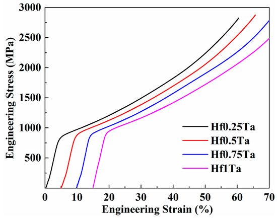 Compressive engineering stress–strain curves of Ti2ZrHfxV0.5Ta0.2 HEAs at RT.