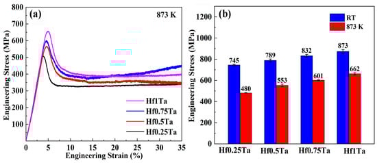 The mechanical properties of the Ti2ZrHfxV0.5Ta0.2 HEAs at 873 K have been investigated, and the compressive stress–strain curves are exhibited in Figure 5a. It can be observed from all the flow curves that apparent softening emerged after the appearance of stress peaks at the initial deformation stage, which was a typical manifestation of dynamic recrystallization. The yield strength of the Hf0.25Ta-Hf1Ta HEAs at 873 K was 480, 553, 601, and 662 MPa, respectively. Figure 5b shows the comparison of yield strength of the Ti2ZrHfxV0.5Ta0.2 HEAs at different temperatures. As the compression test temperature increased from RT to 873 K, the yield strength decreased by 265, 236, 231, and 211 MPa for the Hf0.25Ta-Hf1Ta HEAs, respectively, and the corresponding decline percentages were 34.4%, 29.9%, 27.8%, and 24.2%, respectively. The compression results indicated that the increase of Hf content played a positive role in enhancing yield strength of the Ti2ZrHfxV0.5Ta0.2 HEAs at RT and 873 K. Generally, the alloy melting point was crucial to the softening resistance at elevated temperatures. The melting points of the Ti2ZrHfxV0.5Ta0.2 HEAs increased from 2122 K to 2183 K by the increase of Hf content, which was conducive to the softening resistance improvement. On the other hand, the influence of solid solution strengthening caused by the increase of Hf content on the strength cannot be ignored. Under the dual effect, at 873 K the yield strength of Ti2ZrHfxV0.5Ta0.2 HEAs improved with the increase of Hf content.
