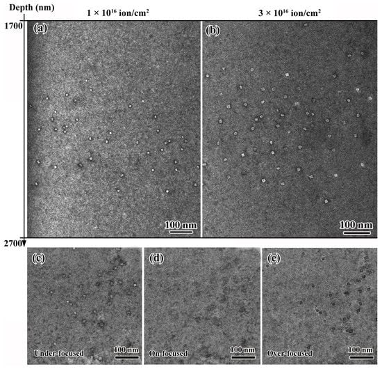 (a,b) Distribution of He bubbles at 1700~2700 nm depth in irradiated samples at different fluences; (c–e) the under-, on-, and over-focused images of He bubble characterization obtained at the same position.