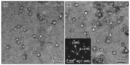 The features of He bubbles in the TEM bright field images taken in the same position under different focusing states are presented in Figure 6c–e, in which white and black spots were found in under- and over-focused conditions, respectively. Under different focusing states, no precipitates could be observed in the peak damage regions.