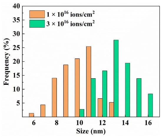 The size distributions of the He bubbles in the peak damage regions are shown in Figure 8. At each fluence, the He bubble sizes in the Hf1Ta HEA presented a unimodal distribution. The average sizes (d) and number densities (N) of the He bubbles in the Hf1Ta HEA at different fluences are listed in Table 5. The average size increased from 10.5 nm to 13.7 nm and number density increased from 9.09 × 1020 m−3 to 2.42 × 1021 m−3 as the fluence improved.