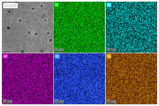 Figure 9 exhibits the elemental distributions near the bubbles in the Hf1Ta HEA irradiated to a fluence of 3 × 1016 ions/cm2. No obvious elemental enrichment regions were detected in the images and the distribution of each element was relatively uniform. Recent studies [40,57] on the HEAs indicated that the atomic size difference dominated the elements segregation under irradiation. In those cases, the vacancies away from the He bubbles were preferentially coupled with the oversized elements, resulting in the enrichment of the undersized elements at the bubbles. Significantly, the radiation-induced segregation may affect the behavior of dislocations/He bubbles and induce stress corrosion cracking, thereby degrading the mechanical properties and putting a negative impact on the irradiation performance of the alloys. The uniform distribution of elements near the He bubbles suggested the good structural stability of the Hf1Ta HEA under the given irradiation condition.
