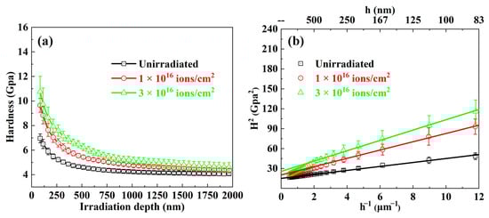 Nano-indentation tests were employed to assess the mechanical properties of the Hf1Ta HEA after He ions’ irradiation. Figure 10a shows the average hardness dependence of indentation depths of the unirradiated and irradiated Hf1Ta alloy. Due to the surface effect on the measurement accuracy, hardness values measured at the depths less than 80 nm were not reliable and omitted. At the same depth, the irradiated sample possessed higher hardness values than the unirradiated one, which suggested the hardening of irradiated Hf1Ta HEA. For the indentation size effect, the hardness decreased slightly with increasing the indentation depth as shown in Figure 10a, which could be described by the model proposed by Nix and Gao [61]:
