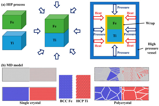 (a) Illustration of hot isostatic pressing process, and (b) molecular dynamic model of single-crystal and polycrystal Fe-Ti diffusion couple.