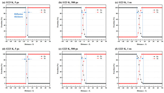 To quantitatively analyze the Fe/Ti interface diffusion, we measured the diffusion layer thickness at the Fe/Ti interface by calculating the diffusion distance. We also recorded the atomic concentration distribution along the diffusion direction at different diffusion times, as illustrated in Figure 3a–c. The diffusion layer became thicker with time. Additionally, simulations were also conducted at a temperature of 1223 K, and the corresponding atomic concentration distributions are presented in Figure 3d–f. It can be observed that the diffusion layer thickness at 1223 K was relatively larger compared to that at 1123 K.