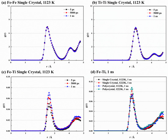 Comparison of RDF curves at different conditions of (a) Fe-Fe, (b) Ti-Ti, (c) Fe-Ti, and (d) Fe-Ti at 1 ns.