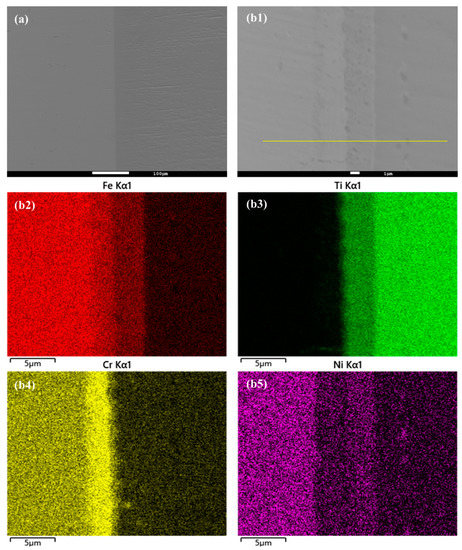 (a) Microstructure of Fe-Ti interface after HIP at 950 °C and 30 MPa for 40 min, and (b1–b5) higher magnification and EDS element mapping result.