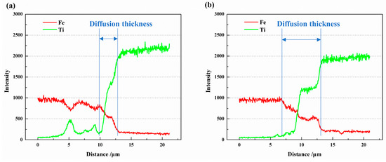 The EDS line scan results of Fe and Ti atoms along the yellow lines in Figure 6(b1) and Figure 7(b1) are depicted in Figure 8. It is evident that a diffusion layer exists at the Fe/Ti interface, with the diffusion layer thickness being greater at 950 °C compared to 850 °C. At 850 °C, the diffusion layer thickness was 2.96 μm, while at 950 °C, it increased to 6.62 μm. Furthermore, the two sub-layers observed at the Fe-side and Ti-side can also be identified. As the temperature increased from 850 °C to 950 °C, the thickness of the sub-layer at the Fe-side increased from 0.87 μm to 2.47 μm, and the thickness at the Ti-side increased from 2.09 μm to 3.15 μm. It is worth highlighting that the sub-layer thickness at the Ti-side was greater than that at the Fe-side, indicating a faster diffusion rate from Fe to Ti compared to Ti to Fe. In a separate study by Li et al. [5], the formation of intermetallic compounds (IMCs) at the Fe/Ti interface was also observed. However, their work involved diffusion welding carbon steel and commercial pure titanium, revealing the presence of mostly TiC IMCs. Although they detected FeTi and Fe2Ti particles at the Fe/Ti interface, there was no plateau stage in element distribution at the interface, as observed in the present study.