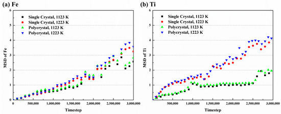 MSD curves with time of (a) Fe and (b) Ti atoms at different temperatures.