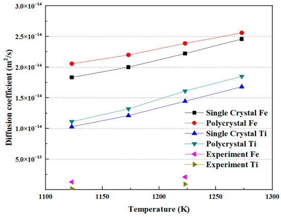 As mentioned above, the diffusion coefficient results from both MD simulations and diffusion welding experiments have been obtained. Figure 10 illustrates the relationship between the diffusion coefficient and temperature. The diffusion coefficient exhibits a relationship with increasing diffusion temperature. Both Fe and Ti atoms show an increase in diffusion coefficient as the temperature rises, with Fe having a higher diffusion coefficient than Ti. Additionally, it can be observed that the diffusion coefficient in polycrystals is higher than that in a single crystal under the same conditions. In the experimental measurements, for Fe and Ti atoms, the diffusion coefficients of each at a diffusion temperature of 1123 K were 1.27 × 10−15 m2/s and 1.56 × 10−16 m2/s, respectively. At a diffusion temperature of 1223 K, the diffusion coefficients of each were 2.07 × 10−15 m2/s and 9.1 × 10−16 m2/s, respectively. These values are comparable to those obtained by Li et al. [5]. Xiang et al. [24] proposed that there is a temperature criterion for the diffusion between Fe and Ti. In this study, it can also be observed that the trend of the diffusion coefficient changing with temperature in the simulation results agrees well with the experimental results. However, the values of the diffusion coefficients in the experiments are less than those obtained in the MD simulation. The reason may be the existence of the gap, or noncontinuous interface, between Fe and Ti in the experiments.