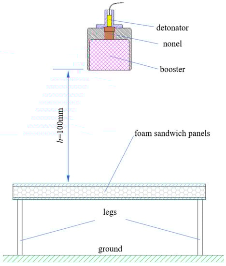 In order to study the dynamical response performance of the foam-nickel sandwich panels under the load of near-field blast, a near-field blast experimental platform was designed, as shown in Figure 1. Pins (legs) were used to fasten the sandwich panels by drilling holes in the edge circumference of the structure, and the entire structure was placed on level ground. The explosive suspended above the sandwich structure with the height of 100 mm was used to generate near-field blast load and was detonated by a bridge-wire type electric detonator that was connected to the explosive at one end and connected to the blasting device placed in the safety cover with a twisted pair of wires at the other end. The explosive used in the blast test is cylindrical-shaped 8701 explosive with a total charge weight of 35 g, and the explosive shell is covered with thin nylon material.