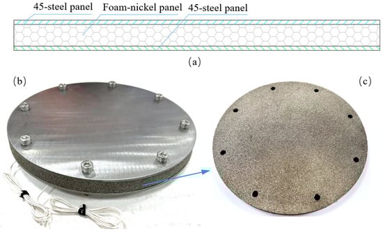 The sandwich structure based on foam-nickel core material has a diameter of 175 mm, which mainly consists of a top panel, foam-nickel core material and a bottom panel, as shown in Figure 2. In this structure, the top and bottom panel material both are made of 45 steels with the thickness of 2 mm, and the core material was made of open porosity foam-nickel prepared by foaming process with the total thickness of 10 mm, the density of 1.15 g/cm3, and the average spherical porosity of 0.3–0.5 mm. As shown in Figure 2c, the bubble in the foam-nickel material is spherical, and mounts of small holes are opened in the bulkhead to connect the spheres, which is conducive to sound absorption, filtration and sound attenuation. Three boards were placed in the order according to Figure 2 and tightened with 8 screws and nuts distributed circumferentially.