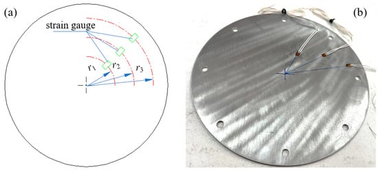 In order to test the strain of the bottom panel under near-field explosion, the BE120-3AA-P500 strain gauge with a resistance of 120 Ω was selected. Before the test, the three strain gauges located at radii of 30 mm, 50 mm and 70 mm, respectively, were pasted on the surface of the bottom panel by use of epoxy glue (CC-302A), as shown in Figure 3. The input end of the strain bridge box was connected to the strain gauge wire, and the output end of the bridge box was connected to the LZSDSP-8CH-5M strain adopted device.