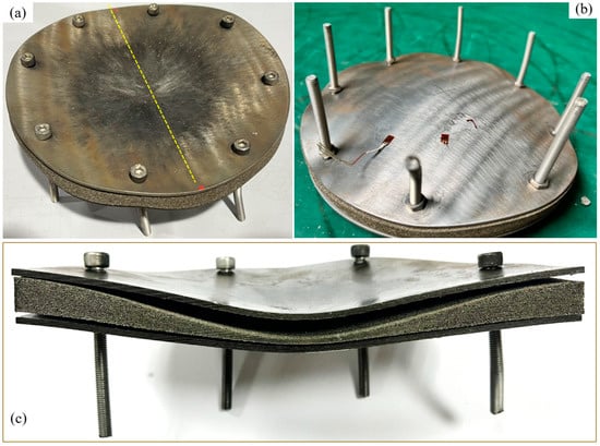 After the test, the sandwich structure constructed on foam-nickel core material and steel plates was recovered and observed, as shown in Figure 5a,b. Under the action of explosion shock wave, the top panel of the sandwich protective structure was damaged and deformed, and the total structure underwent significant deformation, especially the foam-nickel panel, but no panel was broken through. Furthermore, the sandwich structure was dissected along the deformed bottom of the structure by wire-cutting method, and the damage and deformation details of the top panel and bottom panel were obtained, as shown in Figure 5c.