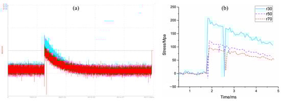 After explosion, under the action of shock wave, the strain gauge was detached from the bottom panel or the wire was cut, which leads to the real peak value possibly not being measured in the test data. The data in the second half of the curve should be interference signals coupled from the wire. Therefore, in the data analysis, the data of the rising edge of the signal are considered as valid data. The above signal was processed by progressive filtering (frequency of 25 kHz), as shown in Figure 7b.