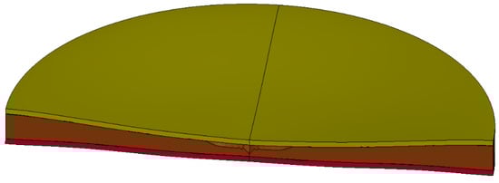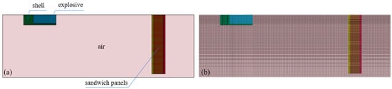 Similar to the experiments, a free-field explosion model of sandwich structure based on foam-nickel core material was established, which was composed of explosives, air, charge shell and sandwich protection structure. In the modelling of sandwich structure, the definition of contact algorithm between the steel plates and foam-nickel core material is set as Automatic Surface_to_Surface contact, which describes the free contact state for the actual sandwich structure. Moreover, the parameter values of Fs and Fd are set as 0.2 and 0.1 [27]. Fluid–structure coupling method was used for the calculation, where ALE algorithm was adopted on explosives and air, and the explosives were wrapped with air layer. Due to the bi-symmetry of the structural shape and blast load of the model, the free-field explosion model was established by using the 1/4 model, as shown in Figure 8. The geometric model was discretized into a finite element model of hexahedral elements, and the size of the sandwich protective structural element was controlled at about 1 mm.