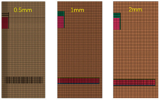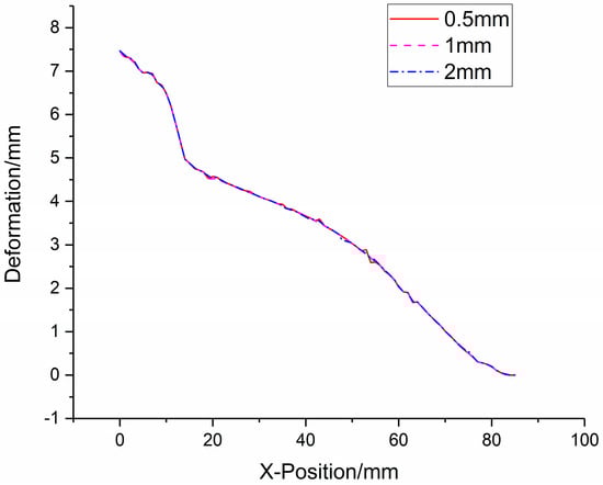 The deformation data of foam-nickel core material of sandwich structures under different mesh sizes are shown in Figure 9. It can be seen from deformation–position curves of the foam-nickel core material of sandwich structures under different mesh sizes that, when the mesh size is between 0.5 mm and 2 mm, the impact on the numerical simulation results is limited, as shown in Figure 10. In other words, on the premise of meeting the accuracy of numerical simulation, in order to reduce the amount of calculation as much as possible, it is reasonable to select the mesh size of 1 mm for numerical simulation in this paper.