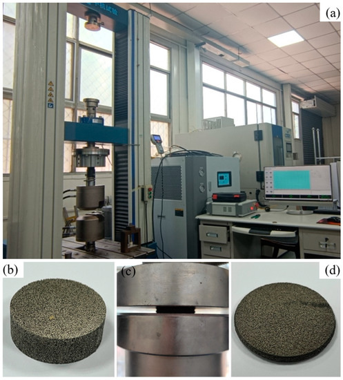 The size of cylindrical specimen is 30 × 10 mm, the density is 2.23 g/cm3 and the test process of mechanical properties of foam-nickel material is shown in Figure 11.