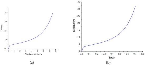 As shown in Figure 12a, the load–displacement characteristics of foam-nickel material were obtained through the above quasi-static mechanical properties test with the loading rate of 10−3/s. It can be seen from the curve that, at the beginning, the foam-nickel material presents an ideal linear elastic deformation under the compression load, and the load increases uniformly with the displacement. Then, with the increase in displacement, the slope of the curve decreases obviously, and this process lasts for a long time, which is the main stage of energy absorption of foam-nickel. Finally, the foam-nickel structure was compacted, the structure density increases and the load increases rapidly with the increase in displacement, which is the densification stage of foam-nickel.