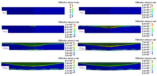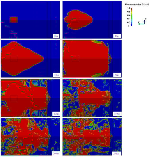 According to the above established finite element model of sandwich structure based on foam-nickel core material, finite element software was used to calculate the response characteristics of sandwich structure in the process of shock wave transmission after explosive explosion. During calculation, the detonation moment is set to 0 μs, the result file is output once every 1 μs and the total calculation time is 500 μs. The effect diagram of the explosion simulation calculation process is shown in Figure 13.