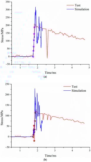 After the end of the simulation calculation, the stress–time characteristic curve of the bottom panel of the sandwich structure under the blast load was established, and the simulation data of the stress–time characteristics of the bottom panel were compared with the test results, as shown in Figure 18. As mentioned above, after explosion, under the action of shock wave, the strain gauge was detached from the bottom panel or the wire was cut. Therefore, the real peak value may not be captured in the measured data, and the data in the second half of the curve should be interference signals coupled in from the wire. Furthermore, in the progressive data analysis, it is considered that the part of the rising edge of the signal is valid data. Therefore, when comparing and analysing the simulation data of the stress–time characteristics of the bottom panel with the test results, the rising edge part of the signal, that is, the data during the period of 1.75 ms to 1.82 ms (the part marked ★ in Figure 18) were only considered in this paper.