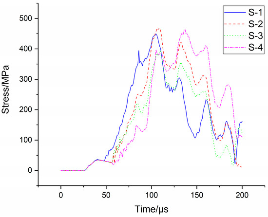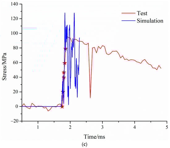 As can be seen from Figure 18, the stress–time characteristics simulation data of the bottom panel are consistent with the rising edge trend of the test curve, indicating that the simulation data are highly consistent with the test results.