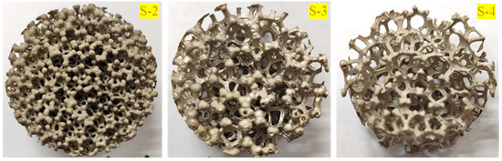 Compression test specimens of foam-nickel material with three different porosities (n = 85% for S-2, n = 90% for S-3 and n = 95% for S-4).